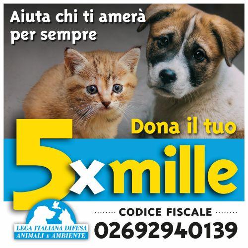 Con un semplice gesto che non ti costa nulla, puoi fare la differenza nella vita degli animali che ogni giorno lottano per la loro sopravvivenza. Scegli di destinare il tuo 5x1000 alla Lega Italiana per la Difesa degli Animali e dell'Ambiente Onlus, con Presidente l’onorevole Michela Vittoria Brambilla, e contribuisci concretamente alla nostra azione in favore degli amici a quattro zampe.