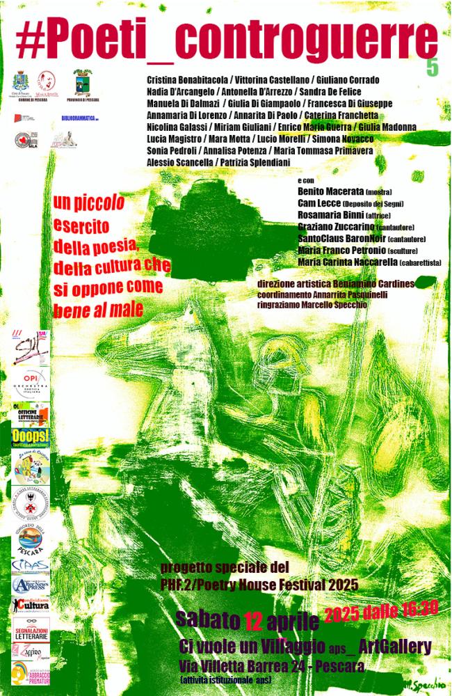 “Un piccolo esercito di poesia e cultura che si oppone come bene al male” un grande reading di poesia e arte, sabato 12 aprile dalle ore 16:30 a “Ci vuole un Villaggio aps_ArtGallery” (Via Villetta Barrea 24 a Pescara), progetto #Poeti_controguerre5 che vede la partecipazione di alcune delle voci più significative della poesia italiana d’oggi, artisti di ogni linguaggio espressivo, cantautori, cabarettisti. Direzione artistica a cura di Beniamino Cardines.