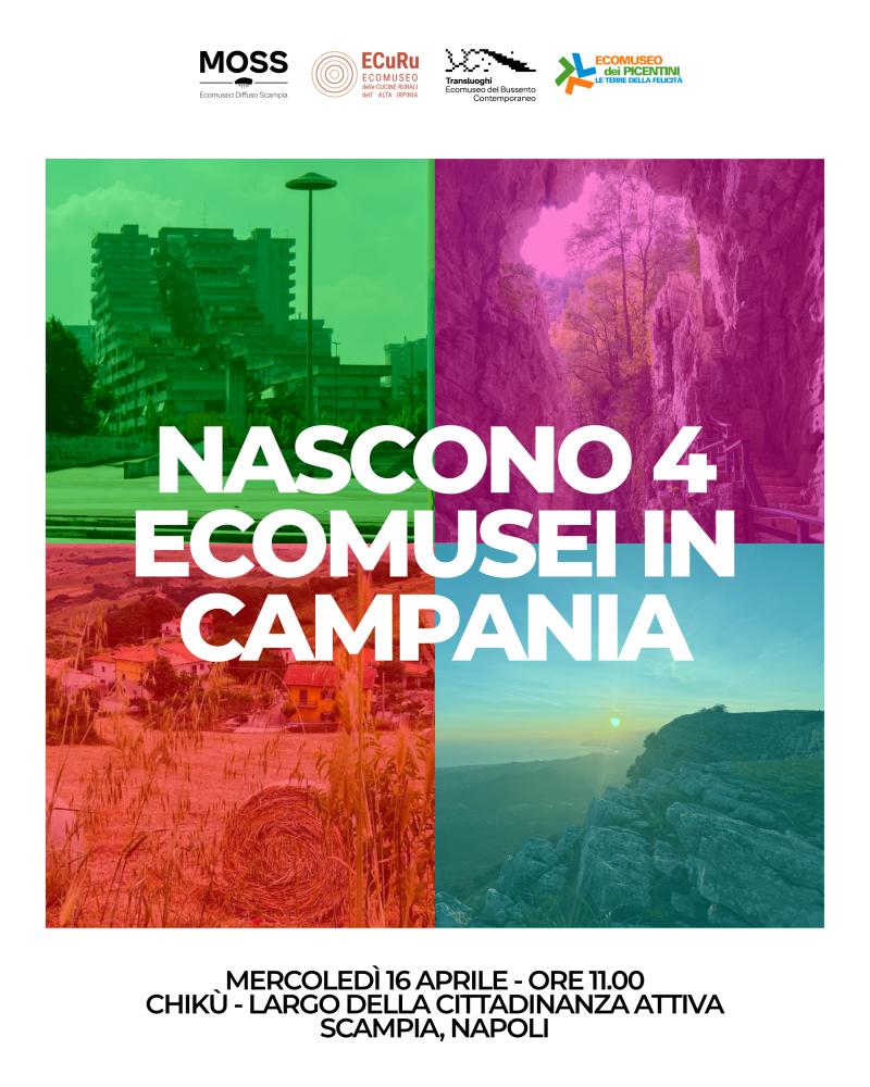Sono quattro le realtà disseminate in Campania che hanno ricevuto il Riconoscimento di Ecomuseo della Regione ai sensi dell’art. 4 della L.R. 13/2023 “Riconoscimento e promozione degli ecomusei della Campania”. Si tratta di MOSS - Ecomuseo diffuso di Scampia (NA), Transluoghi - Ecomuseo del Bussento Contemporaneo (SA), Ecomuseo dei Picentini - Le Terre della Felicità (SA), ECuRu - Ecomuseo delle Cucine Rurali dell'Alta Irpinia (AV). Mercoledì 16 aprile alle 11 presso il Centro Chikù, Largo della Cittadinanza Attiva, Napoli, sede del MOSS - Ecomuseo diffuso di Scampia e dell’associazione chi rom e…chi no, i quattro Ecomusei si racconteranno alla cittadinanza e alle istituzioni per condividere un assaggio del loro patrimonio. All’evento saranno presenti con i quattro ecomusei della Campania, Valeria Ciarambino, Vicepresidente del Consiglio Regionale e prima firmataria della proposta di legge per gli ecomusei, Felice Casucci, Assessore alla Semplificazione amministrativa e al Turismo della Regione Campania, Nicola Caputo, Assessore all’Agricoltura della Regione Campania. Seguiranno interventi delle scuole e delle reti territoriali.