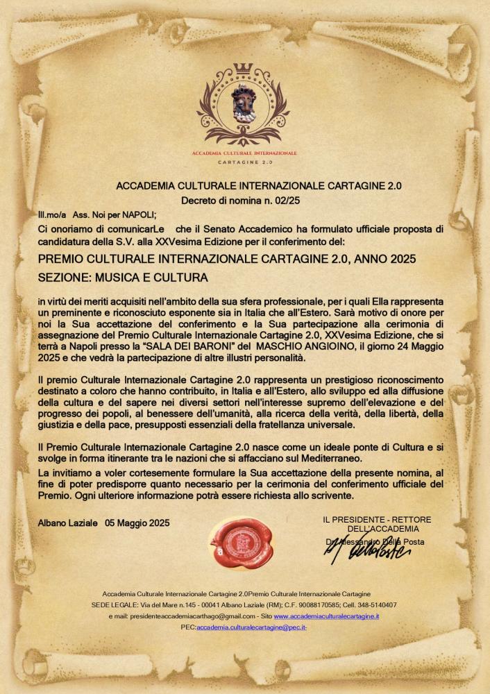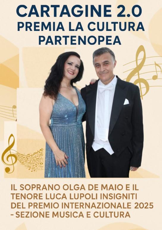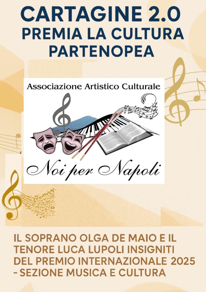 > “Desideriamo condividere, annunciare con grande gioia, onore ed orgoglio che l'Associazione Culturale Noi per Napoli riceverà il 24 maggio p.v., presso il Maschio Angioino a Napoli, il prestigioso Premio Culturale Internazionale Cartagine 2.0 – 2025 per la sezione Cultura e Musica, che sarà ritirato dai suoi rappresentanti legali e artistici, il soprano Olga De Maio e il tenore Luca Lupoli.