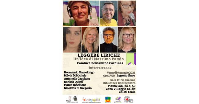 Venerdì 9 maggio, a seguito del successo dei primi incontri, continuano a Chieti Scalo gli incontri della manifestazione “Lèggère liriche” presso la Biblioteca “Marilia Bonincontro” del Centro Aggregativo Villaggio Celdit in Piazza San Pio X, 59. Incontri mensili aperti al pubblico che prevedono la lettura di alcune liriche da parte di poeti abruzzesi, con conversazione aperta ai presenti moderata da Beniamino Cardines. L’idea, di Massimo Pamio, fa parte di un ciclo di iniziative proposte dal centro culturale con il patrocinio di Chieti Solidale e del Comune di Chieti, in collaborazione con il MLA/Museo Lettera d’Amore.