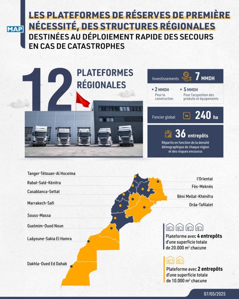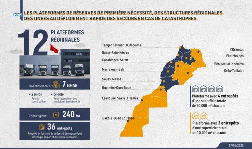 Per le sei regioni più popolate – Casablanca-Settat, Rabat-Salé-Kénitra, Marrakech-Safi, Fez-Meknes, Tangeri-Tetouan-Al Hoceima e Souss-Massa – le piattaforme includeranno quattro magazzini per un totale di 20.000 m² ciascuno. Le altre sei regioni – Oriental, Béni Mellal-Khénifra, Drâa-Tafilalet, Guelmim-Oued Noun, Laâyoune-Sakia El Hamra e Dakhla-Oued Ed Dahab – disporranno di due magazzini di 10.000 m² in totale. Le scorte previste sono destinate a consentire una risposta rapida in caso di calamità , rispondendo alle esigenze di soccorso, assistenza e cura delle vittime di calamità , nello spirito della visione proattiva reale.