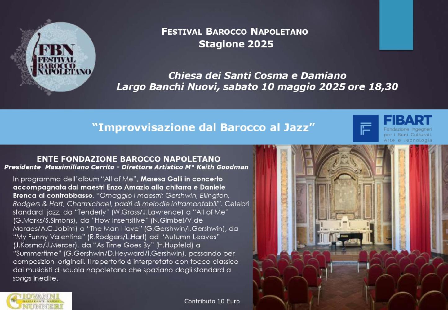 Sabato 10 maggio, alle ore 18.30, presso la Chiesa dei Santi Cosma e Damiano, Largo banchi Nuovi, Napoli, “Improvvisazione dal Barocco al Jazz”. In concerto il Maresa Trio per la Stagione concertistica del Festival Barocco Napoletano, a cura di Massimiliano Cerrito e con la direzione artistica del m°Keith Goodman. Con la jazz vocalist Maresa Galli suonano i maestri Enzo Amazio alla chitarra e Daniele Brenca al contrabbasso. Un concerto di jazz eseguito con tocco classico ed elegante, spaziando da standard a composizioni originali. La kermesse spazia dal Barocco a generi in continuum con gli stilemi di scuola musicale napoletana, contaminando la musica contemporanea e mettendo in luce i talenti. Il Festival ha tra gli obiettivi la produzione, esecuzione, diffusione musicale, ricerca, editoria ed alta formazione, realizzando concerti nei principali musei e luoghi di interesse storico e artistico italiani.