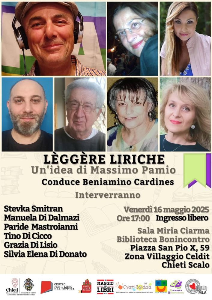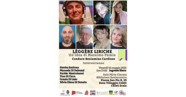 Venerdì 16 maggio, a seguito del successo dei primi incontri, continuano a Chieti Scalo gli appuntamenti della manifestazione “Lèggère liriche” presso la Biblioteca “Marilia Bonincontro” del Centro Aggregativo Villaggio Celdit in Piazza San Pio X, 59. Incontri mensili aperti al pubblico che prevedono la lettura di alcune liriche da parte di poeti abruzzesi, con conversazione aperta ai presenti moderata da Beniamino Cardines. L’idea, di Massimo Pamio, fa parte di un ciclo di iniziative proposte dal centro culturale con il patrocinio di Chieti Solidale e del Comune di Chieti, in collaborazione con il MLA/Museo Lettera d’Amore.