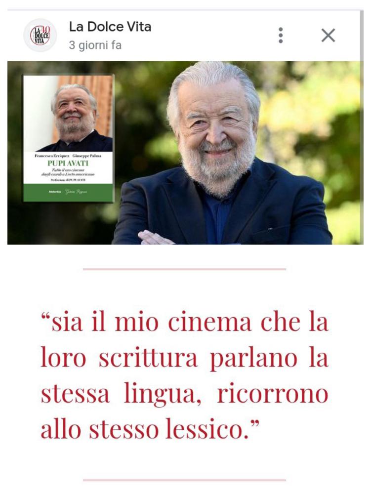 È uscito di recente - per Historica Giubilei Regnani editore - il libro su tutta la biografia cinematografica del regista Pupi Avati, scritto da Francesco Erriquez e Giuseppe Palma.