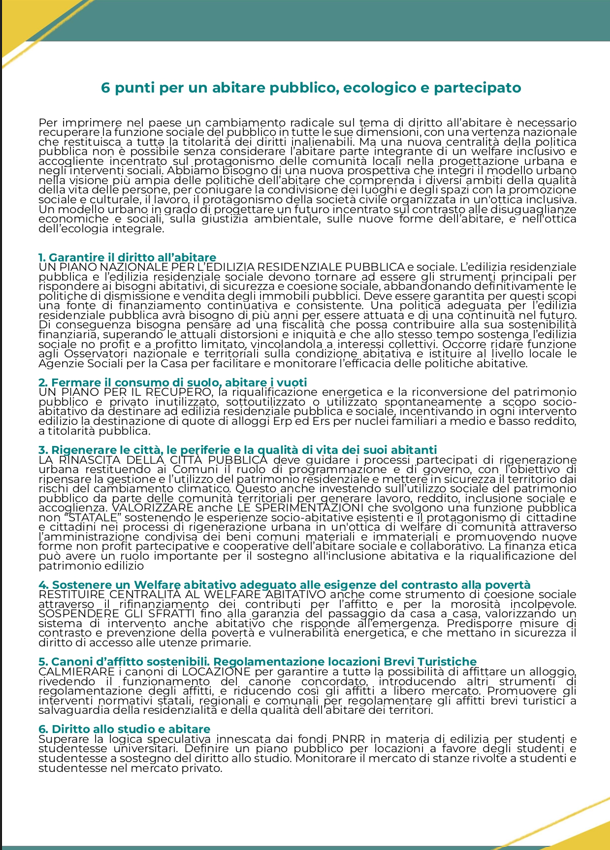 L'evento della rete – che raccoglie l’adesione di oltre 400 organizzazioni tra associazioni, movimenti sociali, comitati di quartiere, cooperative, sindacati inquilini, amministratori locali, esperti e ricercatori provenienti da tutta Italia – si propone di elaborare strategie comuni e proposte concrete per affrontare l'emergenza abitativa e promuovere un nuovo modello di sviluppo urbano equo e sostenibile.