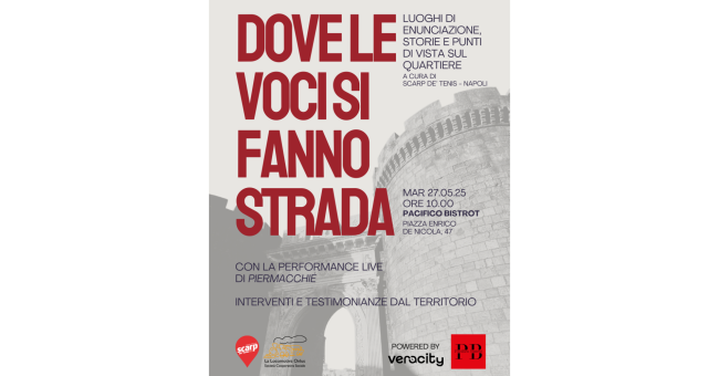 Martedì 27 maggio, alle ore 10:00, il Pacifico Bistrot di Piazza Enrico De Nicola, nei pressi di Porta Capuana, ospiterà l’evento Dove le Voci Si Fanno Strada, organizzato dalla redazione napoletana di Scarp de’ tenis. Un’occasione per condividere storie, esperienze e riflessioni nate durante un anno di laboratori di giornalismo, che hanno esplorato e raccontato il territorio tra Vicaria e San Lorenzo dal punto di vista degli ‘ultimi’, cui la mission del celebre giornale milanese si rivolge.