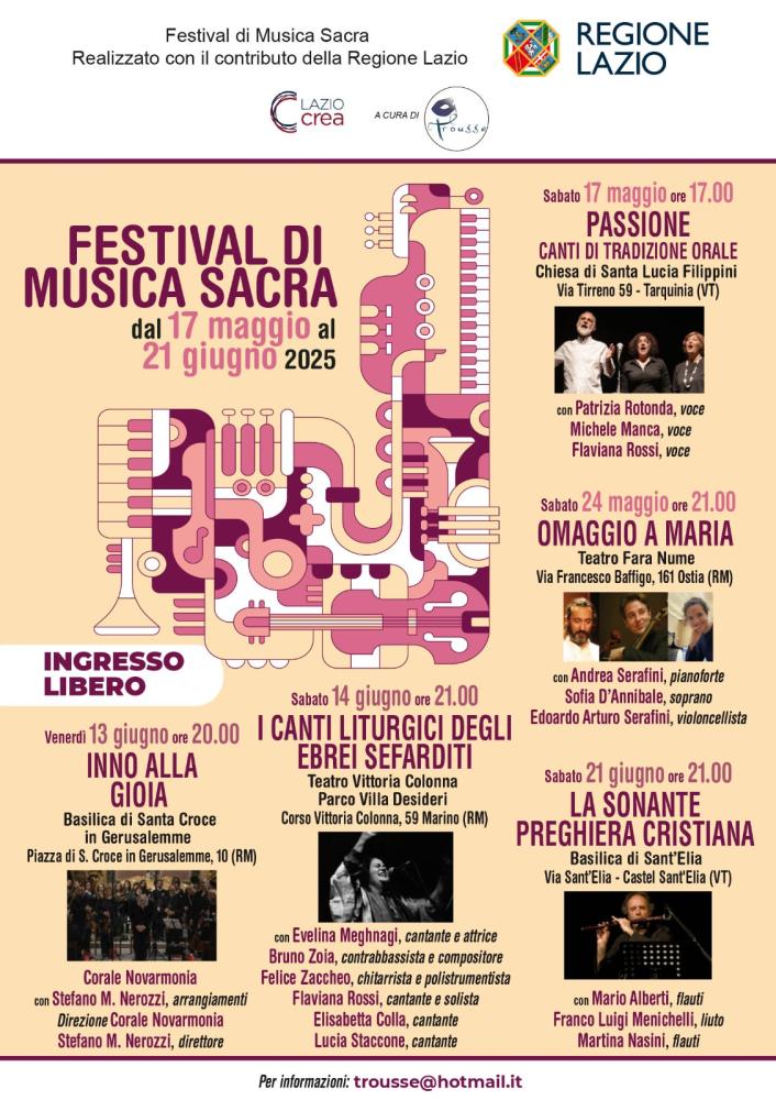 L’Associazione Trousse guidata da Giorgio Granito si è aggiudicata il contributo regionale per la realizzazione del Festival di Musica Sacra che va dal 17 maggio al 21 giugno 2025 in alcuni Comuni del Lazio.