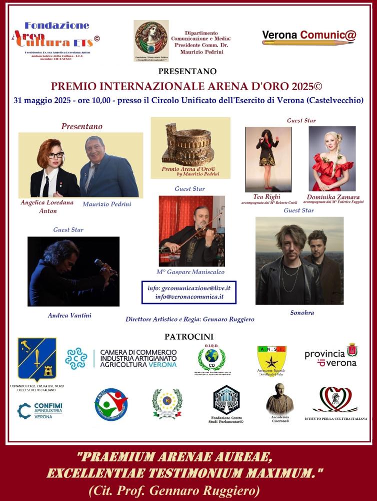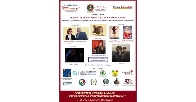 La prestigiosa cerimonia di premiazione si terrà presso la Sala d’Onore del Circolo Unificato dell'Esercito Castelvecchio Verona a pochi passi dall’Arena, il 31 maggio 2025 alle ore 10,00, richiamando quel legame inscindibile tra passato e presente, tra storia e innovazione. I selezionati riceveranno una preziosa riproduzione in resina dell'Arena di Verona, laccata in oro zecchino e montata su una base di legno noce, simbolo di solidità, bellezza e valore.