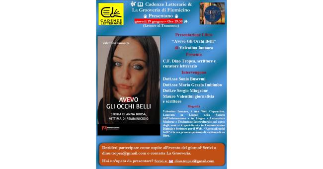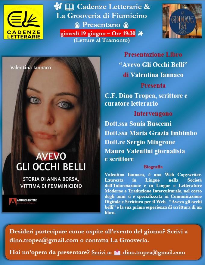 Giovedì 19 giugno 2025, ore 19:30 – Un evento che non è solo cultura, ma resistenza. Una carezza che brucia. Una voce che rompe il silenzio. Alla La Grooveria di Fiumicino, sullo sfondo di un tramonto che sa di respiro e consapevolezza, prende vita il quarto appuntamento della rassegna Cadenze Letterarie, con la presentazione del libro “Avevo gli occhi belli” di Valentina Iannoco, edito da Armando Editore.