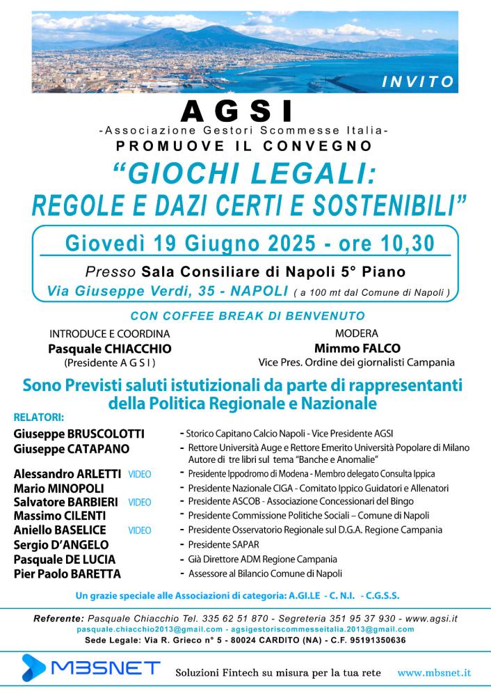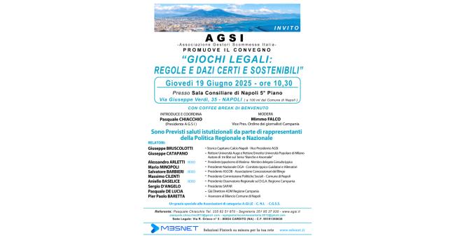 Un appuntamento cruciale per il settore del gioco legale in Italia è alle porte. Giovedì 19 giugno 2025, alle ore 10:30, presso la Sala Consiliare di Napoli (5° piano, Via Giuseppe Verdi 35), a soli 100 metri dal Comune, si terrà il convegno promosso da A.G.S.I. – Associazione Gestori Scommesse Italia, dal titolo: