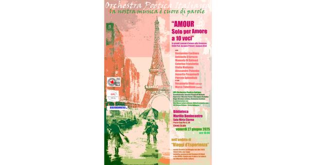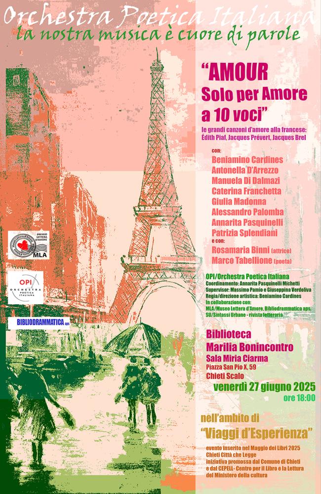A seguire e concludere, sarà ospite l’ OPI/Orchestra Poetica Italiana diretta dal regista Beniamino Cardines, che presenterà “AMOUR/Solo per amore a 10 voci”. Una suggestiva performance a più voci, presentata in lingua francese originale e nella traduzione italiana, che interpreterà le grandi canzoni d’amore alla francese, con testi di: Édith Piaf, Jacques Prévert, Jacques Brel. Progetto speciale, promosso e prodotto da Bibliodrammatica aps, in collaborazione con la rivista letteraria SU/Sintassi Urbane, con il MLA/Museo Lettera d’Amore diretto da Massimo Pamio e Giuseppina Verdoliva.