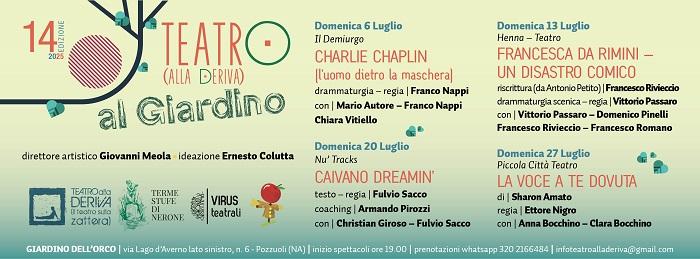 Domenica 13 luglio, alle ore 19.00, si tiene il secondo appuntamento della XIV edizione di una rassegna che continua a regalare al pubblico uno scenario suggestivo e distante dal caos della città ma totalmente nuovo. L’iniziativa, ideata da Ernesto Colutta e Giovanni Meola, che ne firma la direzione artistica per il tredicesimo anno, cambia il luogo di rappresentazione e si trasferisce al Giardino dell’Orco, sito in via Lago Averno n. 6 a Pozzuoli.