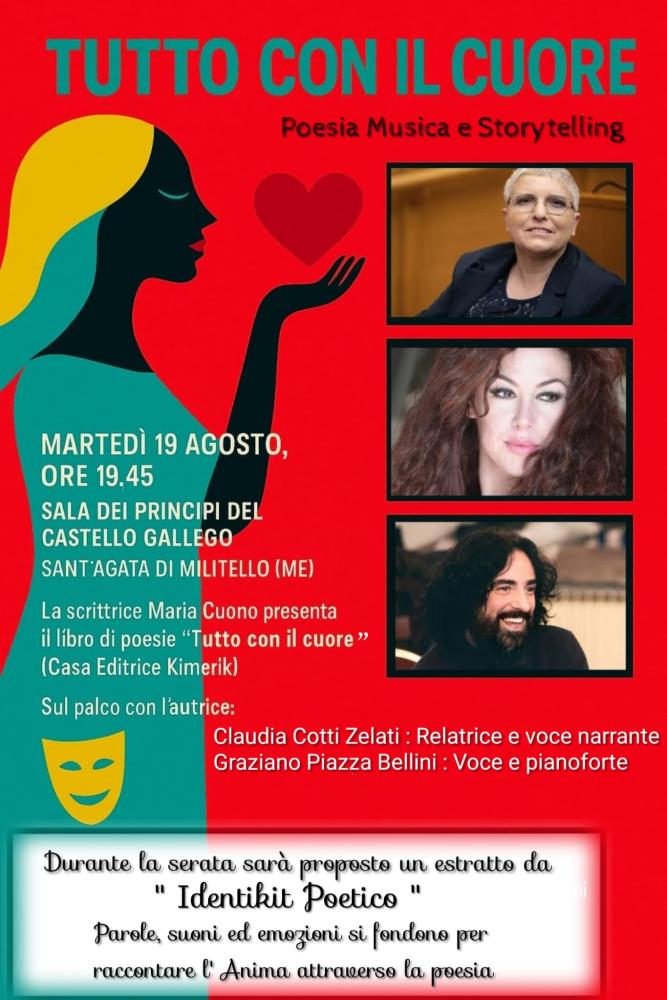 Martedì 19 agosto, alle ore 19.45, nella suggestiva Sala dei Principi all’interno del Castello Gallego di Sant’Agata di Militello, si terrà la presentazione della silloge poetica Tutto con il cuore di Maria Cuono edita dalla casa editrice kimerik, dedicata a Lorella Cuccarini, Monica Sarnelli e Carmen Giardina, con la prefazione del soprano Olga De Maio artista stabile del Teatro San Carlo di Napoli. Ma non aspettatevi un semplice incontro letterario. Il libro non si limita a essere letto, ma vuole essere ascoltato, attraversato e restituito in voce. Quello in programma è un evento ibrido, suggestivo e vibrante, che intreccia parola scritta, narrazione scenica e musica d’autore.