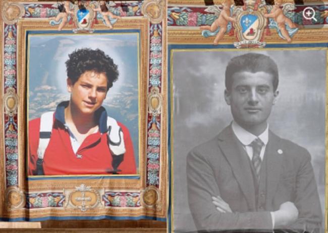 Sulla facciata della Basilica vaticana campeggiano due ritratti. A sinistra, in giacca e cravatta, c’è Frassati, giovane alpinista e terziario domenicano torinese morto nel 1925 all’età di 24 anni per una meningite virale. A destra, con una maglietta rossa, quello di Acutis, studente milanese morto nel 2006 a 15 anni per una leucemia fulminante.