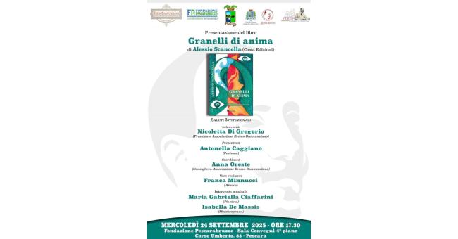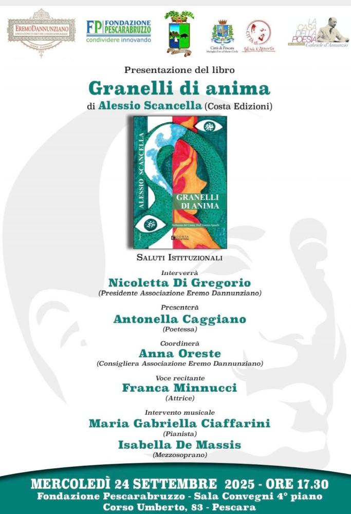 Mercoledì 24 settembre 2025 alle ore 17:30 presso la Fondazione Pescarabruzzo, l’Associazione Eremo Dannunziano con i patrocini della Provincia di Pescara, del Comune di Pescara, della Fondazione Pescarabruzzo, della Casa della Poesia organizza la presentazione del libro “Granelli di anima” di Alessio Scancella, Costa Edizioni.