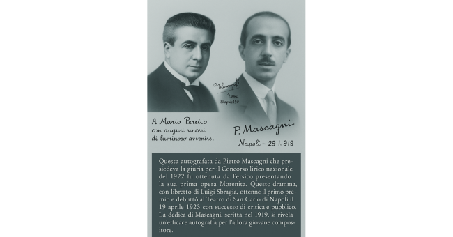 «Un’efficace autografia rivela il legame di stima e di augurale riconoscenza che unì Pietro Mascagni e Mario Persico.»