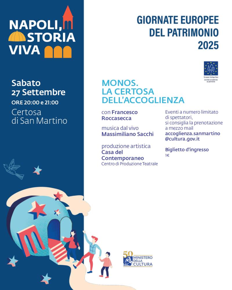 Sabato sera 27 settembre alla Certosa di San Martino un viaggio nella Napoli del 1656, ferita dalla peste e risorta nei silenzi della Certosa , con lo spettacolo Monos. La Certosa dell’accoglienza prodotto e promosso dal centro di produzione teatrale Casa del Contemporaneo, nell’ambito del progetto “Napoli. Storia Viva”. In “Monos. La Certosa dell’accoglienza” attraverso la voce di Micco Spadaro, pittore e testimone, il dolore si fa colore e memoria, il silenzio si fa respiro e canto. Nel quadro che ritrae i monaci nel rendimento di grazie per la scampata epidemia, la città ferita e la preghiera si incontrano: l’arte diventa rifugio e resurrezione. Tra mura antiche e voci che ancora risuonano, questa evocazione teatrale trasforma la tragedia in preghiera, la paura in rinascita. Un atto di presenza che trova nella Certosa stessa la sua culla e il suo destino, luogo di accoglienza e di memoria.