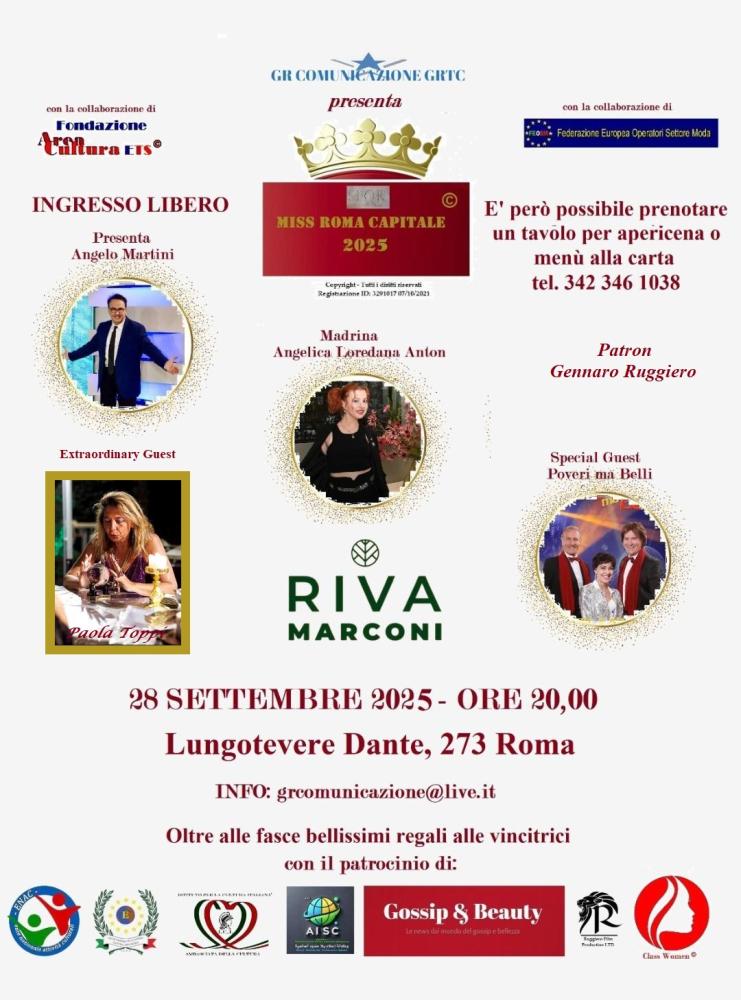 Roma, 28 settembre 2025 – Si rinnova l’atteso appuntamento estivo con la bellezza, l’eleganza e lo spettacolo: il Concorso Miss Roma Capitale torna con la sua edizione 2025, presso la suggestiva cornice del Riva Marconi – Lungotevere Dante, 275, Roma, a partire dalle ore 20:00. Un evento che unisce moda, musica e fascino, sotto la direzione artistica del produttore Gennaro Ruggiero, titolare esclusivo dei diritti del concorso.