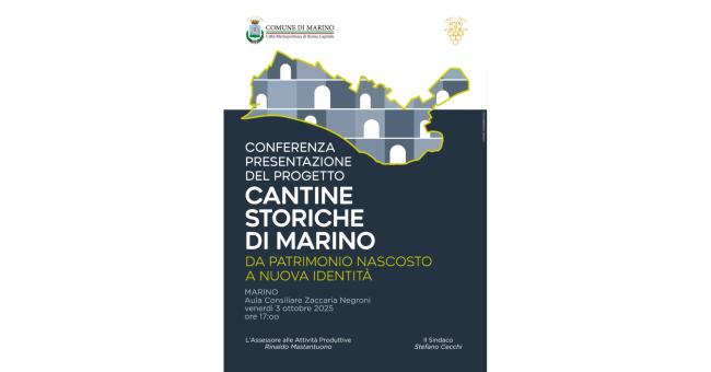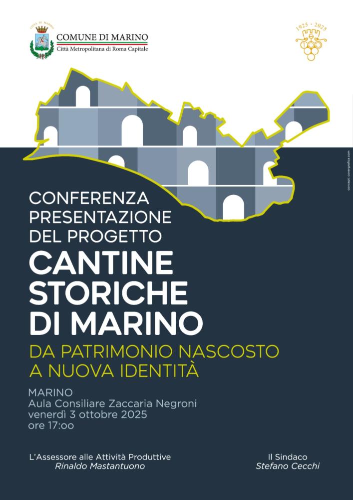 Si terrà venerdì 3 ottobre 2025 alle ore 17,00 presso la Sala Consiliare “Z. Negroni” di palazzo Colonna il Convegno di Presentazione del Progetto Cantine Storiche in occasione del Centenario della Sagra dell’Uva di Marino.