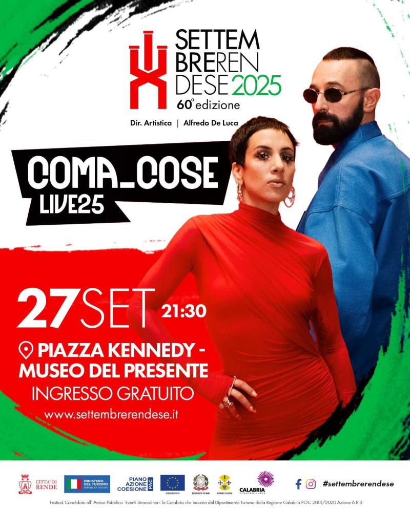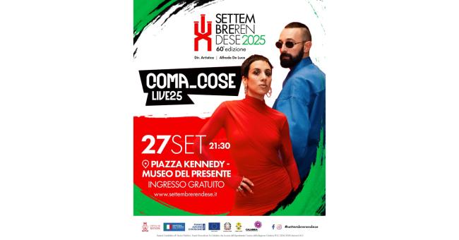 Sabato 27 settembre il gran finale: attesissimo il live dei Coma Cose, il duo milanese reduce dal successo all’ultimo Festival di Sanremo con il brano Cuoricini. Il concerto, previsto in Piazza Kennedy (adiacente al Museo del Presente), si preannuncia come uno degli eventi clou dell’intera edizione, con un’affluenza di pubblico stimata in migliaia di presenze provenienti da tutta la regione.