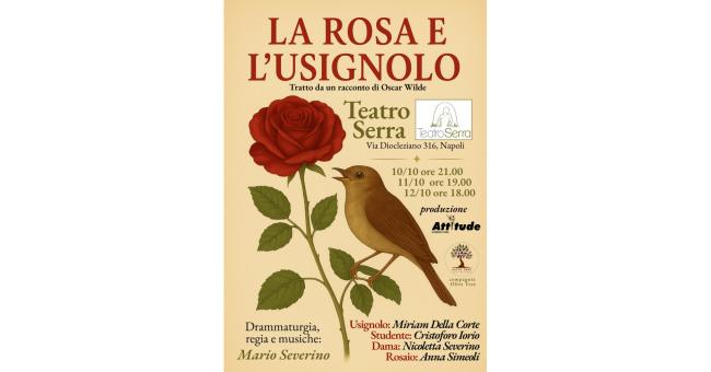 Il Teatro Serra di Napoli inaugura la stagione “Fuorilcassici” con “La rosa e l’usignolo”. Da una favola di Oscar Wilde, l’esordio alla regia del musicista e poeta Mario Severino. Una produzione “Attitude” e “Olive Tree” con Miriam Della Corte, Cristoforo Iorio, Anna Simeoli. Danza e coreografie Nicoletta Severino. Consulenza ai costumi Violetta Di Costanzo. Dal 10 al 12 ottobre in Via Diocleziano 316 (venerdì ore 21:00, sabato ore 19:00, domenica ore 18:00). Info: teatroserra@gmail.com; 347.8051793.