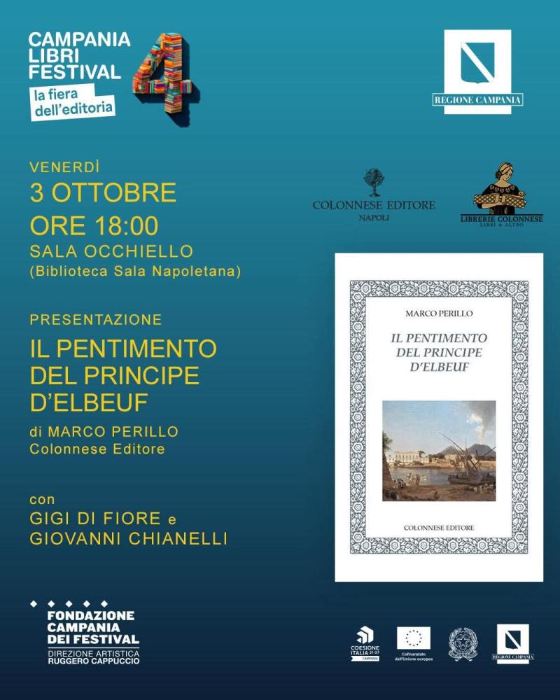 Venerdì 3 ottobre 2025, alle ore 18:00, presso la Sala Occhiello (Biblioteca Sala Napoletana), si terrà la presentazione del libro Il pentimento del Principe d’Elbeuf di Marco Perillo, pubblicato da Colonnese Editore.