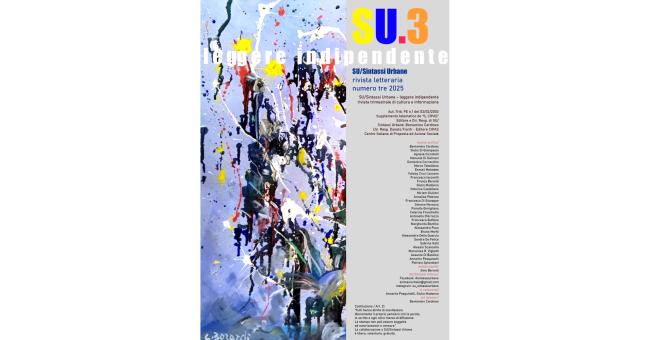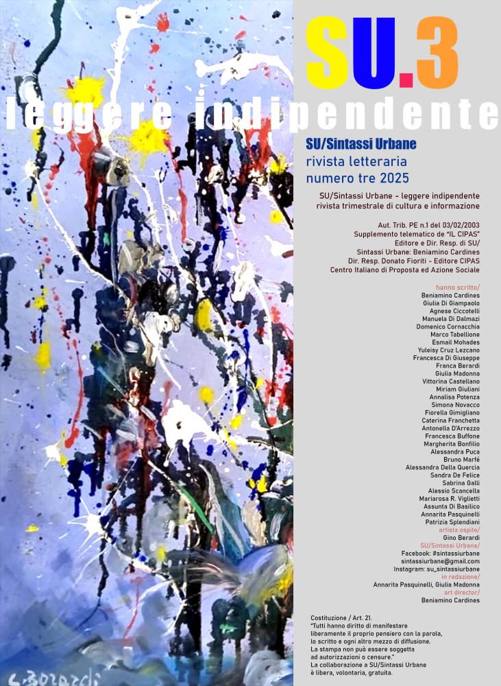 A ottobre esce il nuovo numero di SU/Sintassi Urbane leggere indipendente – rivista letteraria, numero 3. La rivista nasce a Pescara da un’idea di Beniamino Cardines (giornalista e scrittore pluripremiato) e da un confronto aperto con Donato Fioriti (Dirigente Nazionale FIGEC/Federazione Italiana Giornalismo Editoria e Comunicazione). Successivamente da una condivisione collettiva e partecipata con autori e autrici italiani contemporanei, tutti concordi a voler informare raccontando.