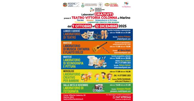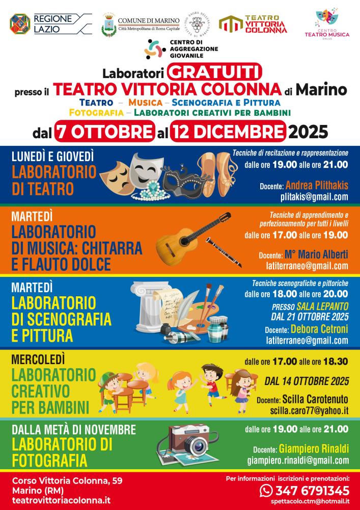 Sono in partenza i Laboratori gratuiti, fortemente voluti dal Direttore artistico del Teatro “Vittoria Colonna” di Marino Giorgio Granito e dal Centro di aggregazione giovanile costituitosi lo scorso anno presso il Comune di Marino e curato dalla Associazione C.T.M. Centro Teatro Musica Onlus.