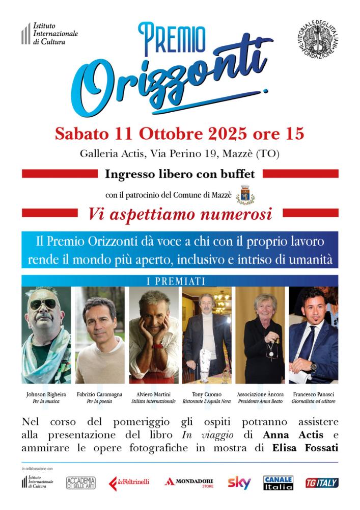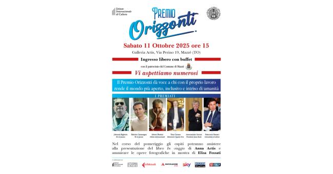 Sabato 11 ottobre, alle ore 15.00, presso lo Spazio Culturale Actis di Mazzè, si terrà la cerimonia di consegna del Premio Orizzonti, riconoscimento che celebra chi, con arte, poesia, creatività o impegno sociale, contribuisce ad ampliare i confini culturali e umani.