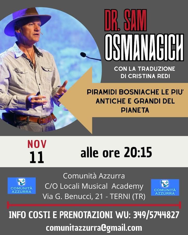 Martedì 11 novembre alle ore 20:15, presso la Musical Academy di Terni in Via Benucci 19, si terrà la tanto attesa conferenza tenuta da un ospite d’eccezione: Sam Osmanagich, l’esploratore e ricercatore internazionale celebre per la scoperta delle enigmatiche Piramidi di Bosnia, considerate da molti le più antiche e imponenti strutture piramidali mai rinvenute al mondo