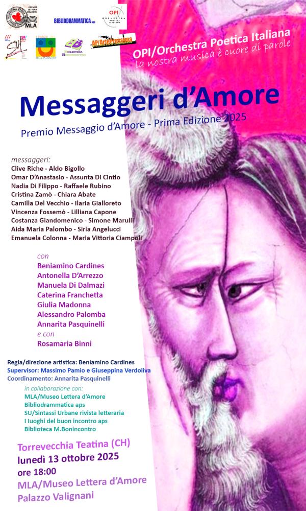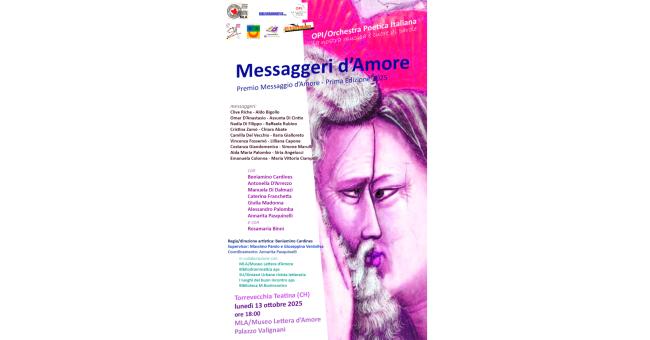 Lunedì 13 ottobre 2025, dalle ore 16 presso il MLA/Museo Lettera d’Amore di Torrevecchia Teatina (CH) si terrà la Premiazione della prima edizione del Premio Messaggio d’Amore 2025 diretto da Massimo Pamio e Giuseppina Verdoliva, già fondatori del Museo.
