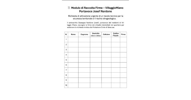 Siracusa – È partita con forza e determinazione la petizione popolare promossa dai residenti di Villaggio Miano, quartiere periferico di Siracusa, per chiedere l’attivazione urgente di un tavolo tecnico dedicato alla sicurezza idrogeologica e sismica della zona. A farsi portavoce dell’iniziativa è un membro Free Lance International Press Nardone, noto come Josef, che a giorni dopo aver raccolto tutte le testimonianze dei residenti di Villaggio Miano nel Siracusano : invia la richiesta via PEC al Servizio Regionale di Protezione Civile – Provincia di Siracusa.