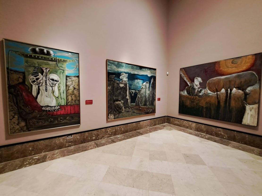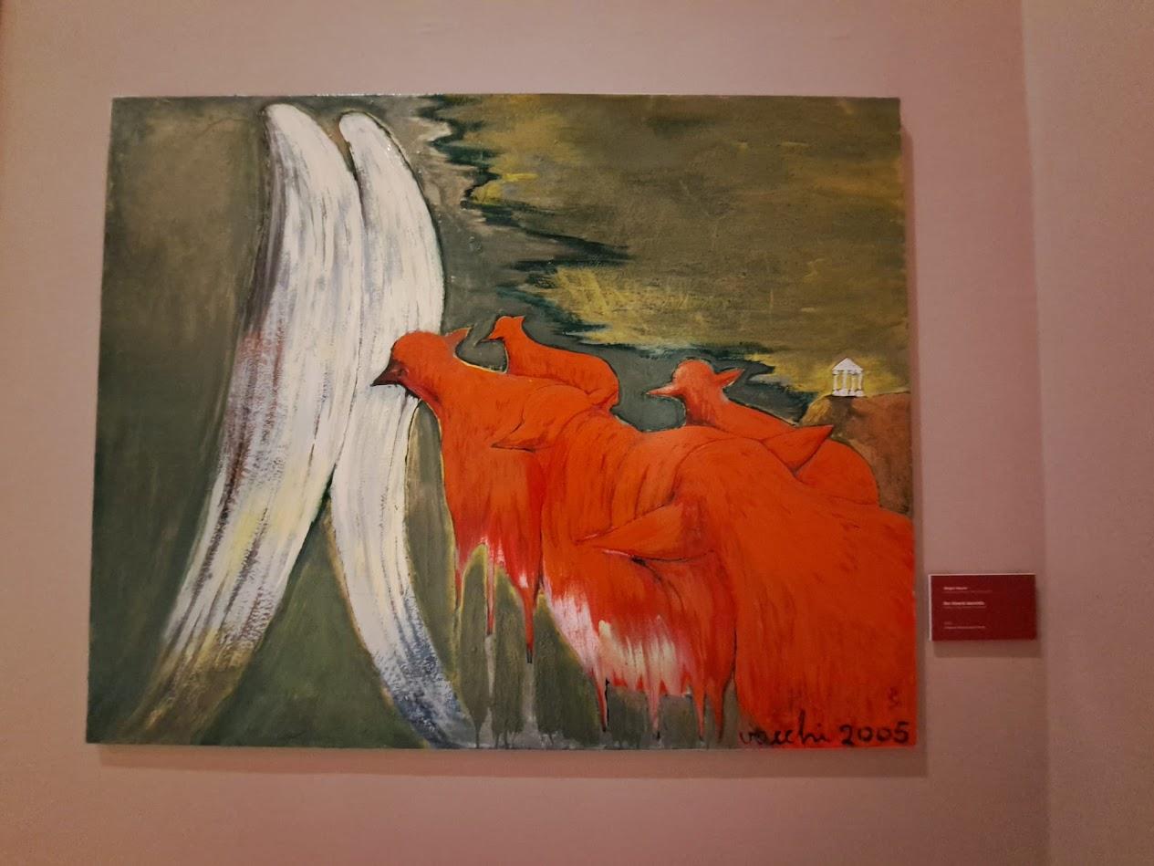 Le sei opere di grande formato si legano idealmente e figurativamente alla realtà storica e fisica partenopea. La tela Primo memoriale organico (1959) è violenta e drammatica come un’eruzione vulcanica: la materia pittorica, densa e grumosa, sembra entrare nelle viscere del Vesuvio e descriverne il magma incandescente un attimo prima che esploda verso l’esterno. In Per un volto del paesaggio (1962) protagonista è il sole, e unico essere vivente un uccello grasso come un gabbiano. L’archeologia, il mare, la storia della regione sono i temi di La telefonata di marmo (1966) e L’amante di Federico II di Hohenstaufen (1966), due dipinti dove Vacchi allude con impareggiabile ironia alla sofisticata eleganza che serpeggia nelle creazioni artigianali, artistiche, architettoniche del Golfo. La rassegna continua con Iter itineris secondo, del 2005, dove l’artista già ottantenne descrive un gregge ammantato di rosso, agnelli con orecchie diaboliche (la dualità della natura umana?) che sembrano planare su un brullo paesaggio costiero. Il tempio greco è piccolo e lontano, come un giocattolo sospeso su un colle: ricordo di glorie passate ormai inutili. Eppure, in questa immagine apocalittica, la speranza si accende in quelle due sciabolate di luce bianca che, come le ali di un arcangelo, attraversano la parte sinistra della tela: profezia e promessa insieme. Della Melancholia Seconda è uno degli ultimi capolavori pittorici di Vacchi, un interno aperto in cui domina il vuoto, un chiaro tributo all’ultima cena leonardesca in cui si affacciano figure animalesche e una mano al centro con un dito che punta verso l’alto.