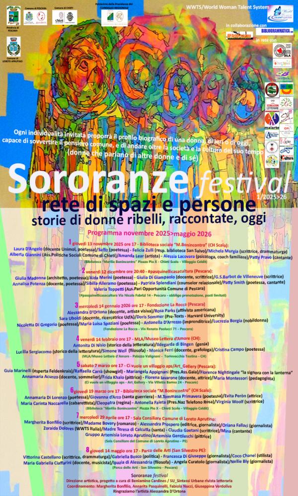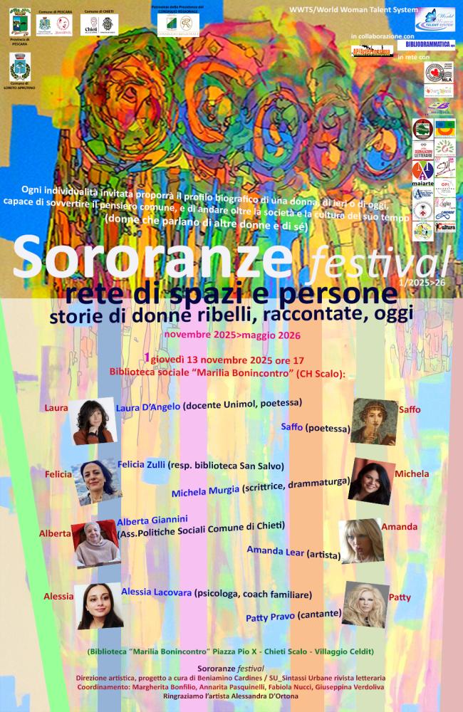 Da giovedì 13 novembre, con una cadenza di incontri mensili e fino a maggio 2026, parte la programmazione del “Sororanze festival – rete di spazi e persone (storie di donne ribelli, raccontate, oggi)”. Ovvero donne che parlano di altre donne e di sé.Un progetto promosso dal WWTS/World Woman Talent System Abruzzo e organizzato da Bibliodrammatica aps, ideazione e direzione artistica a cura di Beniamino Cardines. Coordinamento: Margherita Bonfilio, Annarita Pasquinelli, Fabiola Nucci, Giuseppina Verdoliva.