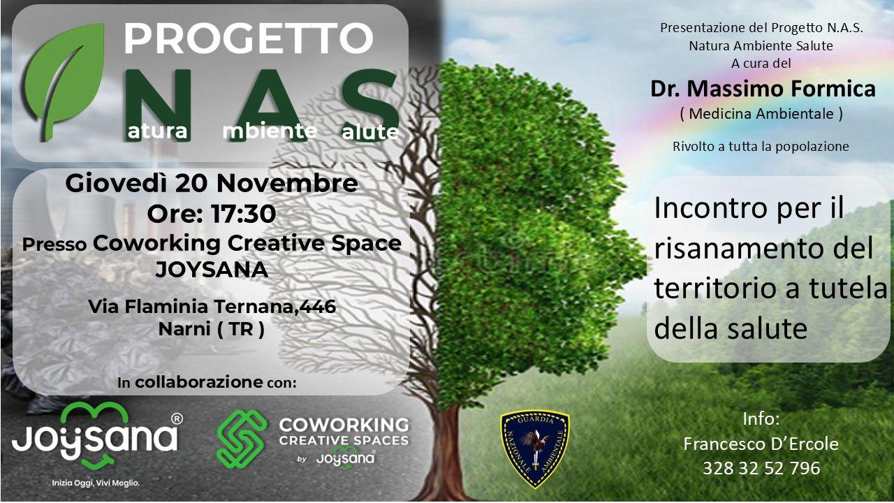 Giovedì 20 novembre alle ore 17:30, presso il Coworking Creative Spaces by Joysana, in Via Flaminia Ternana, 446 – 05035 Narni (TR), cittadini, imprese e istituzioni si ritroveranno per la presentazione ufficiale del Progetto N.A.S. – Natura Ambiente Salute.