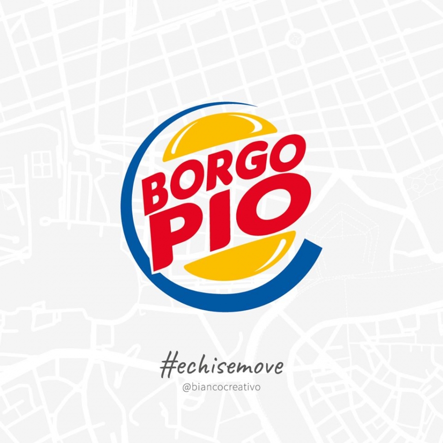 C'è Garbatella, rappresentata come il brand della crema al cacao più amata al mondo, Nutella; Trullo, riprodotto sulla falsariga del social network Twitter; o Borgo Pio che ricorda il logo della celebre catena internazionale di ristorazione fast food, Burger King.