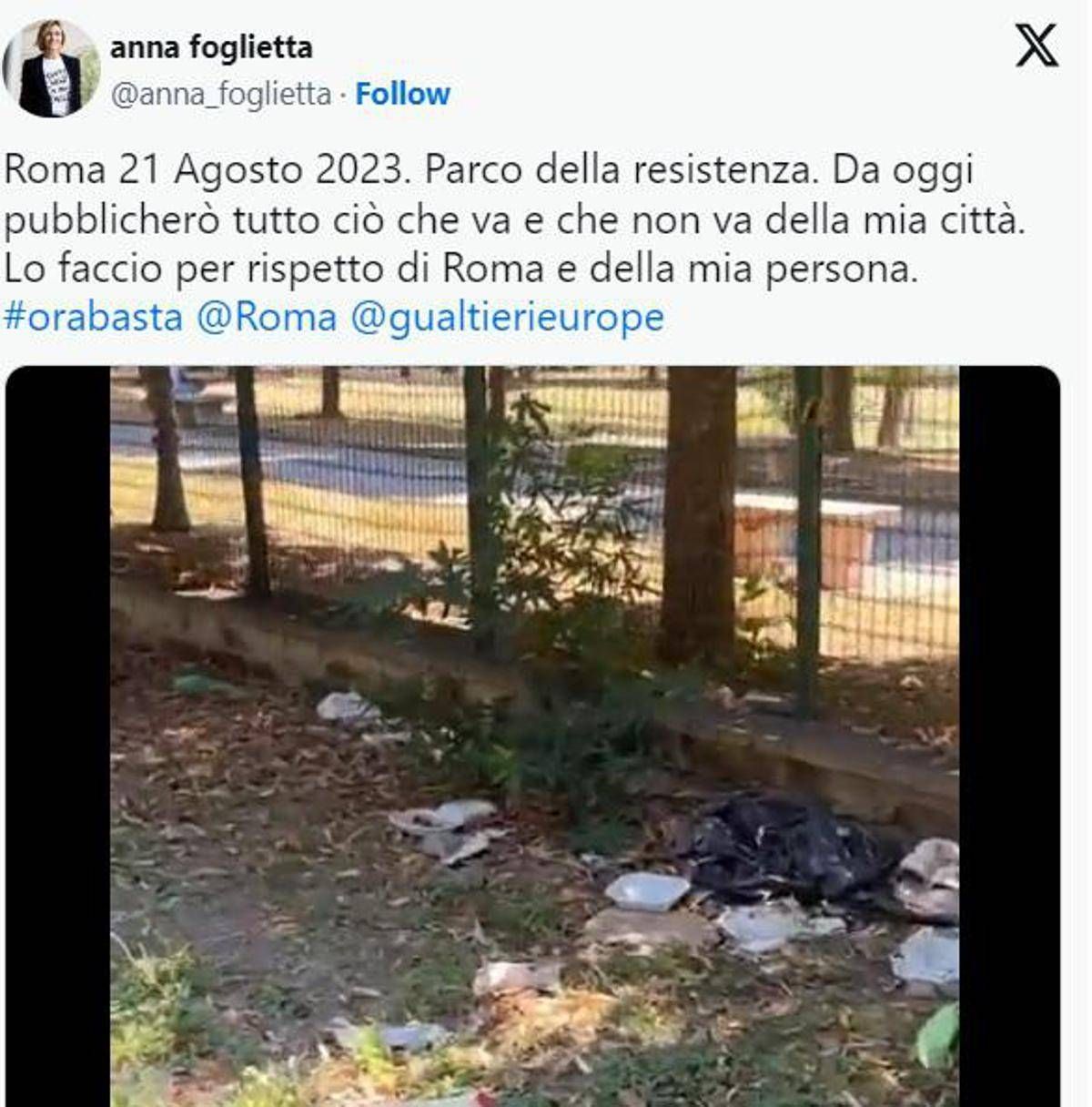 "Questo è un parco che si trova al centro di Roma, al centro di Roma capitale", dice l'attrice, che su Twitter pubblica un video per documentare lo stato in cui versa il Parco della Resistenza. "E' un parco dove dovrei portare i miei figli a giocare. Mi fa schifo entrarci, devo capire per quale motivo la mia città deve essere ridotta in questo stato vergognoso. Parlare con i turisti è imbarazzante, ogni turista che viene qui a Roma dice 'la prossima volta non posso consigliarlo'. Cosa me ne faccio del Colosseo se ogni parco è ridotto in questo stato? 'Roma ogni giorno' sindaco, mi raccomando...", aggiunge rivolgendosi al sindaco Roberto Gualtieri. Â