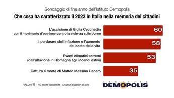 Che cosa resta del 2023 nella memoria degli italiani? L’evento di cronaca più citato è l’uccisione di Giulia Cecchettin, con il successivo movimento d’opinione contro la violenza sulle donne: lo indica il 60%. Per oltre il 50% a caratterizzare l’anno che si chiude sono stati soprattutto il perdurare dell’inflazione, con l’aumento del costo della vita, e gli eventi climatici estremi, a partire dall’alluvione in Romagna. Più di un terzo dei cittadini cita anche la cattura e la successiva morte del capo di Cosa Nostra Matteo Messina Denaro. È quanto emerge dal sondaggio di fine anno dell’Istituto Demopolis, diretto da Pietro Vento, che ha analizzato gli ultimi 12 mesi nella memoria dell’opinione pubblica. Â