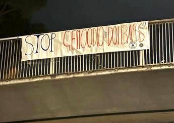 "Stop genocidio in Donbass!". Questo lo striscione affisso all'alba, sul cavalcavia del Colosseo, da Militia Christi - Rete dei patrioti. Â