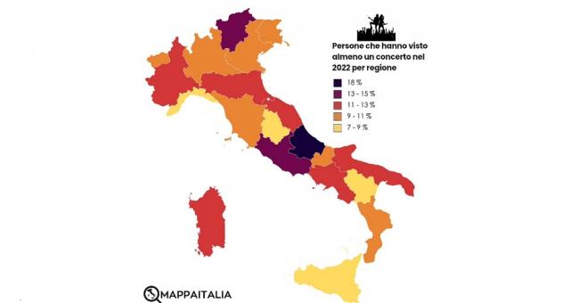 Alla soglia di una nuova stagione musicale Mappa Italia ha elaborato i dati ISTAT del 2022 tracciando un bilancio della partecipazione degli italiani agli show musicali. «Nonostante l'Italia non sia meta di grandi festival, a differenza dei vicini paesi europei, esiste comunque una sorta di turismo musicale: si stima che intorno al 3% degli spettatori dei concerti italiani provenga da altre nazioni» sottolinea Mappa Italia. Regina della musica dal vivo, forse anche a sorpresa, è regina l’Abruzzo registrando la maggior partecipazione ai concerti di tutta Italia: «l'anno scorso ben il 18% degli abruzzesi ha visto almeno un concerto».
