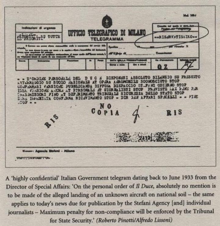 Nello specifico, Pinotti venne in possesso di due telegrammi partiti dall’Agenzia Stefani e datati 1933, nei quali si chiedeva massimo riserbo e assoluta segretezza circa un presunto “atterraggio su suolo nazionale ad opera aeromobile sconosciuto”.