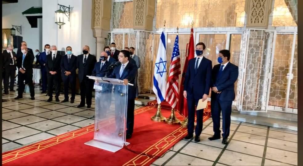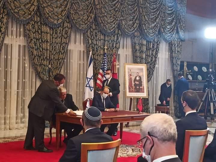 Così il Regno del Marocco, gli Stati Uniti d’America e lo Stato d’Israele, facendo riferimento al colloquio telefonico che ha avuto luogo tra il Re Mohammed VI e il Presidente Donald Trump il 10 dicembre 2020, nonché alle rispettive dichiarazioni storiche pubblicate lo stesso giorno e alla dichiarazione del Primo ministro israeliano Benjamin Netanyahu, accolgono con favore l’opportunità degli straordinari sforzi degli USA e della loro leadership, precisa la Dichiarazione congiunta firmata davanti al Re mohammed VI dal Capo del Governo marocchino Saad Eddine El Otmani, dal Consigliere principale del Presidente degli d’USA Jared Kushner e dal Consigliere alla Sicurezza Nazionale dello Stato d’Israele Meir Ben-Shabbat.