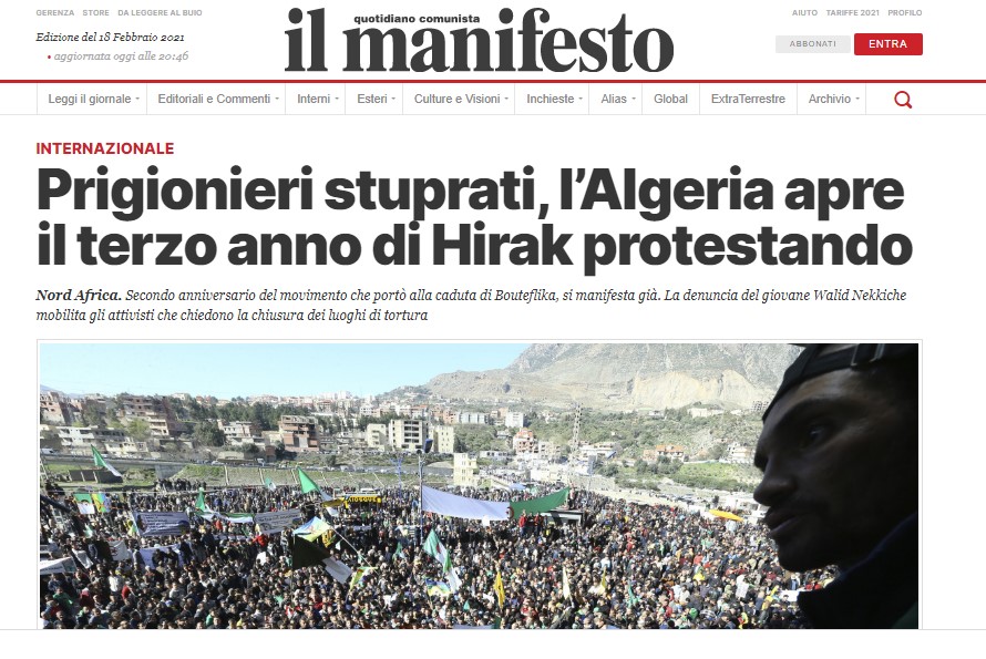 Nel paese guidato dalla casta militare, “prigionieri torturati e stuprati”, intitola il quotidiano italiano “Il Manifesto” un lungo articolo firmato da Stefano Mauro che ha aggiunto “la denuncia del giovane (torturato e stuprato) Walid Nekkiche mobilita gli attivisti che chiedono la chiusura dei luoghi di tortura”. “La testimonianza – continua Stefano Mauro - della scorsa settimana di Walid Nekkiche, studente di 25 anni arrestato a fine novembre 2019 ad Algeri durante una marcia degli studenti dell’Hirak, ha affermato di essere “stato torturato e stuprato da membri dei servizi di sicurezza” nella caserma Antar, conosciuta come luogo di interrogatorio da parte dei servizi di sicurezza”. Secondo Stefano Mauro, Nacera Hadouche, avvocata del network ha detto che “il suo stupro è lo stupro di tutti noi come popolo, società civile e attivisti, proprio per questo abbiamo sporto denuncia e richiesto alla giustizia di intervenire secondo le leggi algerine e internazionali”. Stefano Mauro cita “un tentativo di Tebboune di prendere misure urgenti per far fronte alla profonda crisi economica, sociale e sanitaria, con l’obiettivo di placare un clima di proteste sempre maggiore che comprende i partiti delle opposizioni e i militanti dell’Hirak”.
