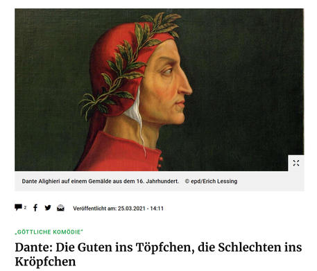 "Dividere il buono dal cattivo": dopo una lunga analisi sulla Divina Commedia la Frankfurter Rundschau ha dato questo titolo al suo giornale. L'analisi eseguita dal quotidiano tedesco mette sullo stesso piano l'opera di Dante Alighieri con quella di William Shakespeare, in occasione della giornata dantesca. L'autore è agguerito contro il Sommo Poeta e scrive che Dante ha "il piacere di giudicare e condannare". "L'amoralità di Shakespeare, la sua descrizione di ciò che è, ci sembra anni luce più moderno dello sforzo di Dante di avere un'opinione su tutto, di trascinare tutto davanti al giudizio della sua morale. Tutta questa gigantesca opera è lì solo per permettere al poeta di anticipare il Giudizio Universale, di fare il lavoro di Dio e di dividere il buono dal cattivo". E se lo dice un tedesco, possiamo crederci, chi meglio di loro può esprimere pareri e giudizi sulla letteratura universale? Con tutti gli esempi che ci hanno dato possiamo solo che rimanere in silenzio davanti a cotanti insegnamenti, però non ce ne vogliate, ma non abbiamo in memoria un rappresentante teutonico contemporaneo di Dante e pari a lui in grandezza, e non ci ricordiamo neanche altri rappresentanti nei secoli a seguire.