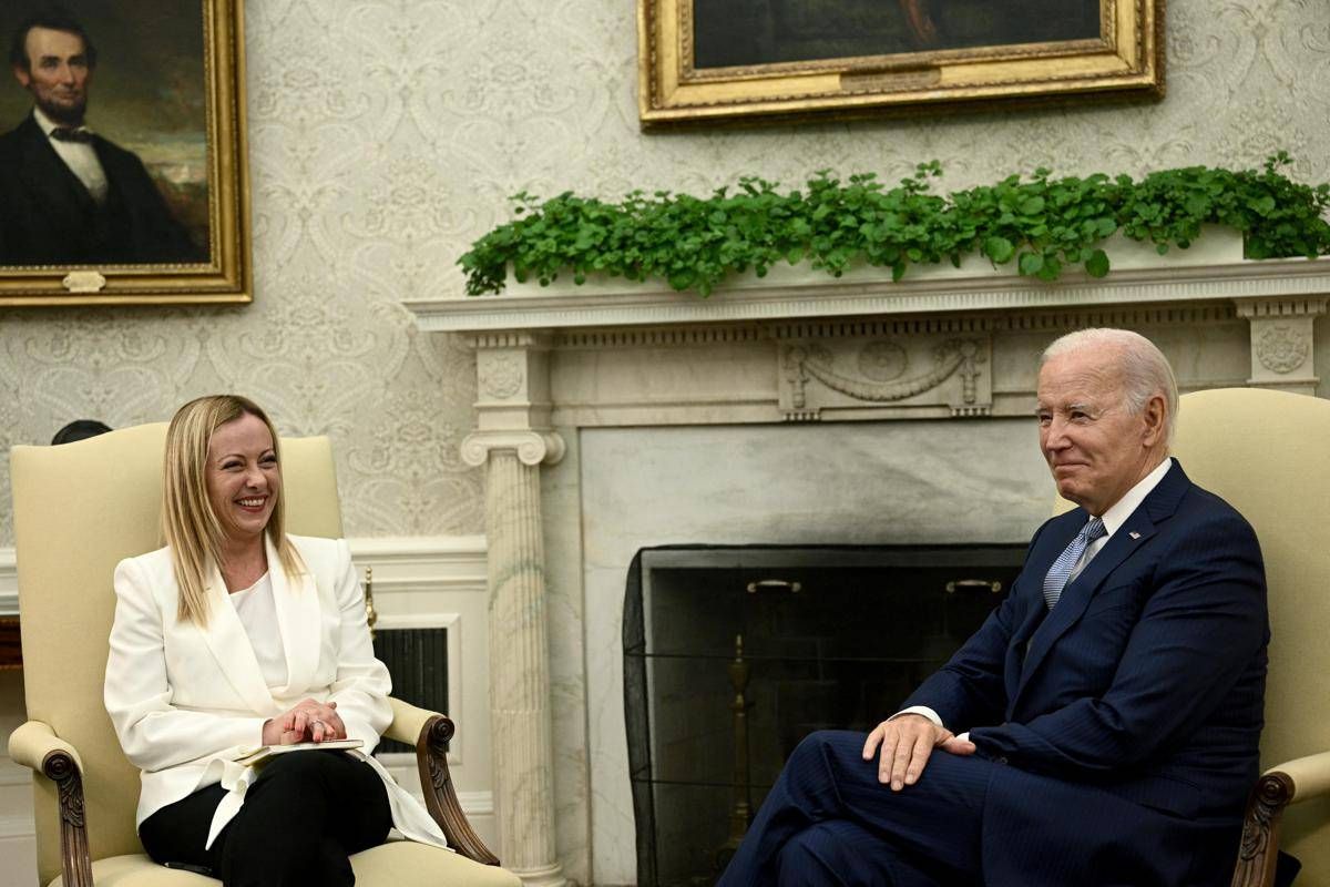 Fa sorridere Giorgia Meloni il presidente statunitense Joe Biden, durante l’incontro alla Casa Bianca, nello studio ovale. Il presidente americano scherza sul fatto che la sua città natale -Scranton, in Pennsylvania- ha una forte comunità di italo-americani e così, racconta, “Nel mio quartiere ero l'unico con questo nome che non finiva in ‘o’, ne ero consapevole", ha raccontato Biden suscitando una risata nella premier. Meloni ha anche ricordato alla premier le origini italiane della first lady Jill, "la nipote di Dominic Giacoppa".Â