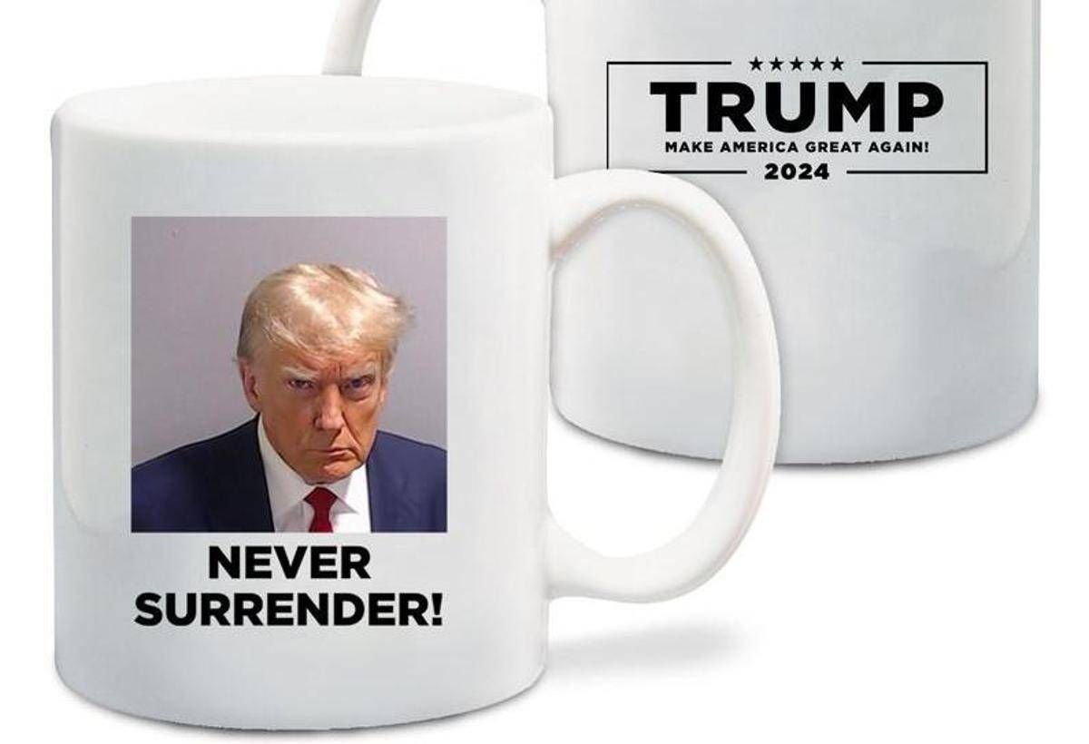 Per cifre che vanno dai 12 ai 34 dollari si possono acquistare adesivi, mug e custodie termiche per bottiglie, magliette a maniche lunghe e corte, bianche e nere, con la foto segnaletica di Trump (la prima scattata a un ex presidente americano) accompagnata dallo slogan "Never Surrender!" (Mai arrendersi). Tutti in vendita con il logo Trump 2024 Make America Great Again.Â