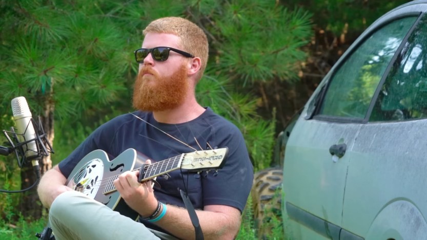 Inizia così la canzone del ragazzo alto con i capelli biondi e la barba rossa, vestito con una maglietta verde e armato di una semplice chitarra.