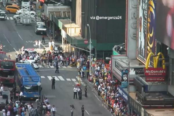 Due bus turistici, caratteristici pulmann a due piani studiati per compiere tour all'interno della “grande mela” (come viene ribattezzata la città dai suoi abitanti), si sono scontrati nell'affolatissima piazza di Times Square, uno degli angoli più ambiti e caratteristici di New York. Nello scontro, avvenuto all'angolo tra la 47° strada e la settima avenue, i due veicoli sono entrati in contatto con le fiancate fino a rimanere incastrati tra un muretto stradale e il traffico, facendo saltare finestrini, atterrando un semaforo e scagliando detriti su un vicino marciapiede sopra ignari pedoni, oltre a far sbalzare alcuni passeggeri fuori dagli autobus. Sul posto sono accorse le squadre dei pompieri di NY e le squadre speciali ESU (Emergency Special Unit) della polizia per portare soccorso nella piazza, faticando non poco a raggiungerla per la folla, tanto che alcune squadre hanno indossato gli zaini di emergenza e sono corse a piedi per arrivare, che nel frattempo si era radunata sul luogo dell'incidente. Sono quattordici, di cui tredici passeggeri e una guida di un autobus, tra cui solo tre sono in gravi condizioni i feriti che alla fine si sono contati per il sinistro, che a parere del vice comandante dei pompieri poteva avere conseguenze ben più disastrose, dato che uno dei due autobus era vuoto mentre l'altro era occupato per la metà. Ancora ignote le cause dell'incidente, anche se dalle prime indiscrezioni uno dei due autobus ha accellerato bruscamente, fino a salire sul marciapiede e finire contro l'altro mezzo . Tali autobus negli ultimi tempi sono stati già coinvolti in altri incidenti di lieve entità, facendo domandare da più parti se non debbano essere modificati per essere resi più sicuri.