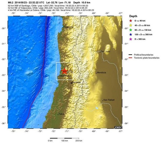 Una serie di scosse telluriche, la cui maggiore ha raggiunto i 6.6 gradi di magnitudo, ha colpito questa notte lo stato sudamericano del Cile, nella zona di Valparaiso. La prima scossa di oltre 6 gradi della scala Richter è arrivata alle 00.32 ora italiana, localizzata a circa 32 km di profondità e distante 118 chilometri da Santiago del Cile, seguita da altre sette scosse, al momento, tra i 3 e 4 magnitudo. Non sono stati registrati fenomeni collegati ad uno tsunami sulla costa né al momento sono stati riscontrati feriti gravi in seguito al terremoto mentre in diverse città la corrente elettrica è venuta a mancare in molte zone insieme alle telecomunicazioni, con particolare riferimento a quelle della telefonia mobile. Un furioso incendio si è sviluppato all'interno di un grattacielo a Valparaiso, nella zona di Vina del Mar, anche se al momento non ci sono prove che sia stato direttamente provocato dal sisma. La zona intorno alla città di Valparaiso purtroppo non è nuova agli eventi sismici, essendo già stata colpita nel 1730 (con 3.000 vittime), nel 1906 (oltre 3.000 vittime) , nel 2010 e 2012, insieme alle scosse del luglio scorso.